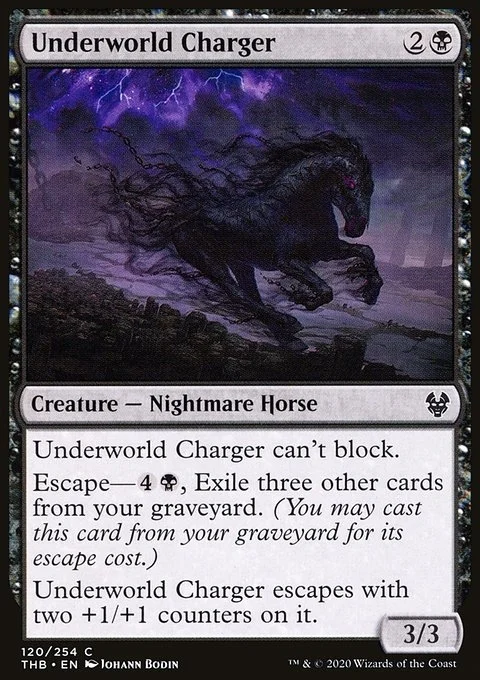 This creature can't block. Escape—{4}{B}, Exile three other cards from your graveyard. (You may cast this card from your graveyard for its escape cost.) This creature escapes with two +1/+1 counters on it.