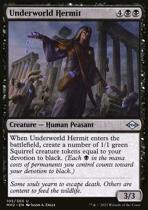 When Underworld Hermit enters the battlefield, create a number of 1/1 green Squirrel creature tokens equal to your devotion to black. (Each {B} in the mana costs of permanents you control counts toward your devotion to black.)