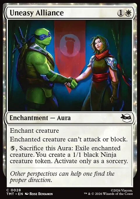 Enchant creature Enchanted creature can't attack or block. {5}, Sacrifice this Aura: Exile enchanted creature. You create a 1/1 black Ninja creature token. Activate only as a sorcery.