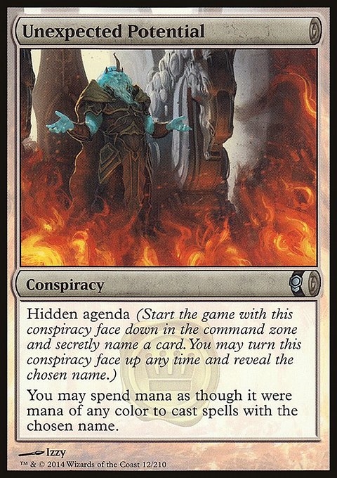 Hidden agenda (Start the game with this conspiracy face down in the command zone and secretly choose a card name. You may turn this conspiracy face up any time and reveal that name.) You may spend mana as though it were mana of any color to cast spells with the chosen name.