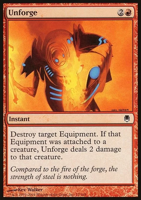 Destroy target Equipment. If that Equipment was attached to a creature, Unforge deals 2 damage to that creature.