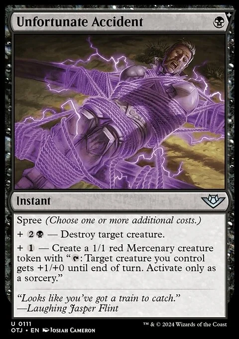 Spree (Choose one or more additional costs.) + {2}{B} — Destroy target creature. + {1} — Create a 1/1 red Mercenary creature token with "{T}: Target creature you control gets +1/+0 until end of turn. Activate only as a sorcery."