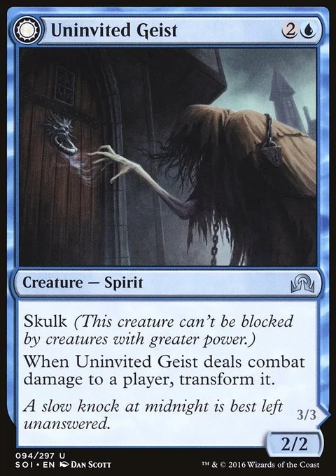 Uninvited Geist Skulk (This creature can't be blocked by creatures with greater power.) When Uninvited Geist deals combat damage to a player, transform it. Unimpeded Trespasser Unimpeded Trespasser can't be blocked.