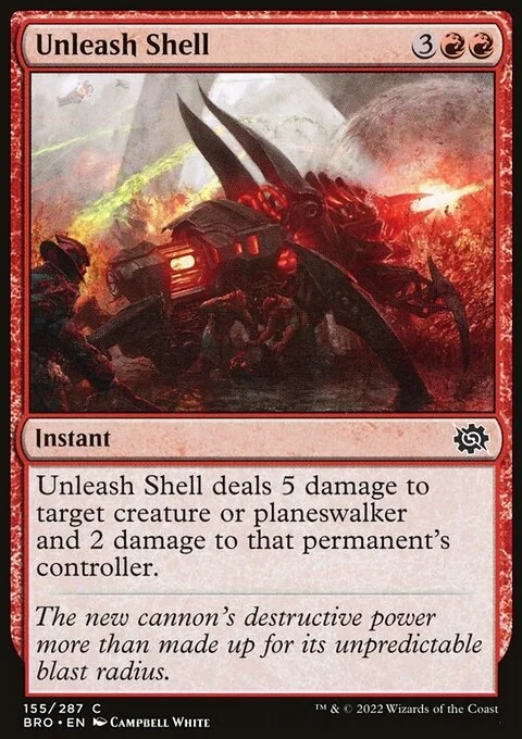 Unleash Shell deals 5 damage to target creature or planeswalker and 2 damage to that permanent's controller.