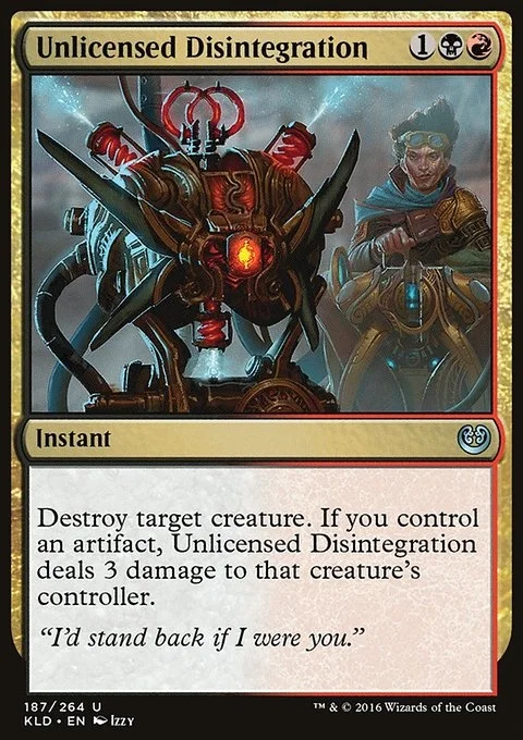 Destroy target creature. If you control an artifact, Unlicensed Disintegration deals 3 damage to that creature's controller.
