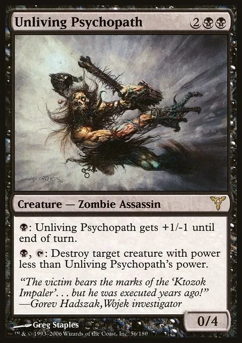 {B}: Unliving Psychopath gets +1/-1 until end of turn. {B}, {T}: Destroy target creature with power less than Unliving Psychopath's power.