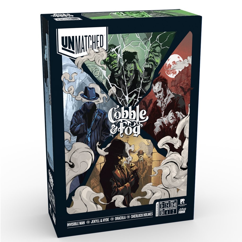 Unmatched: Cobble & Fog features four new heroes for the Unmatched system. Invisible Man uses fog to dart around the board and strike without warning. Sherlock, with the trusty Watson by his side, schemes and calculates to ensure victory. Dracula and the sisters slowly drain you of your power. Jekyll & Hyde uses the former's cunning and the latter's brute strength to win the day.