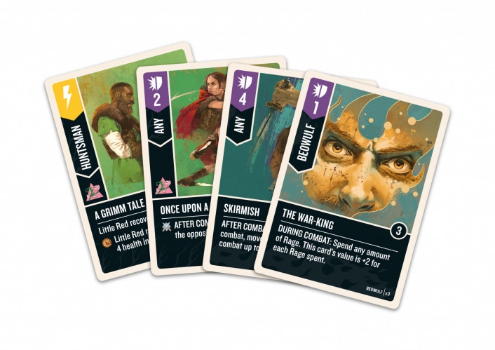 Little Red features a clever card-combo mechanism. Matching icons on the cards she plays to the one in her "basket" (discard pile), triggers potent effects. Meanwhile, Beowulf uses rage to power up his cards for devastating attacks.
