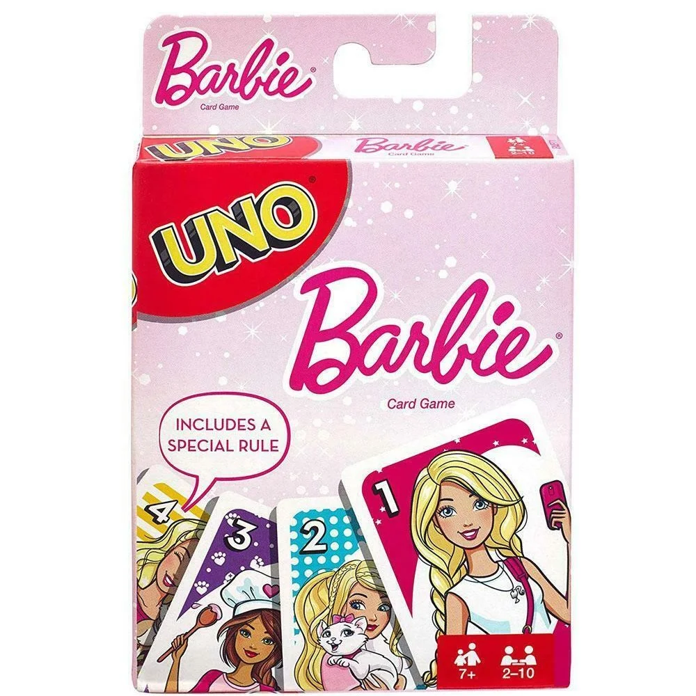 It's the fun, fast-paced card game we all love - now featuring iconic characters from the world of Barbie! Players race to get rid of all their cards by matching a card in their hand with the current card shown on top of the deck. Watch for the Fashion Swap Card - when you play this card, pick any two players (even yourself) and a colour. Then, the two chosen players must swap all cards of that color. This card is also a wild card, so the color you choose also becomes the color that resumes play. First player or team to reach 500 points wins – and when you're down to one card, don't forget to yell 'UNO!'