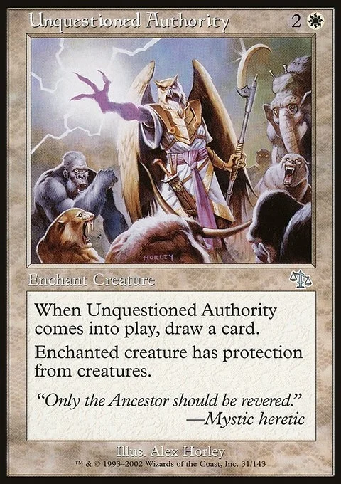 Enchant creature When Unquestioned Authority enters the battlefield, draw a card. Enchanted creature has protection from creatures.