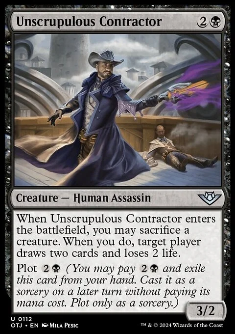 When Unscrupulous Contractor enters the battlefield, you may sacrifice a creature. When you do, target player draws two cards and loses 2 life.