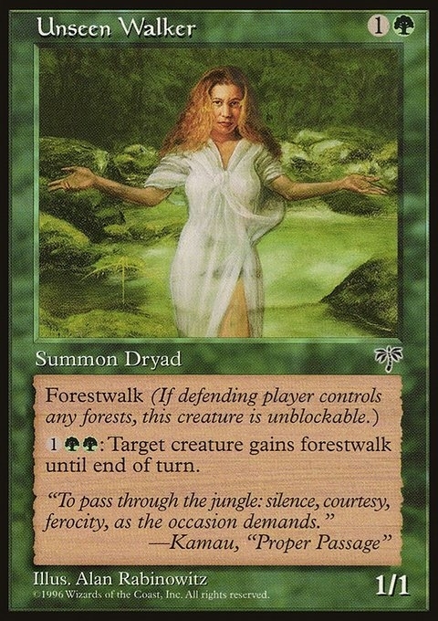 Forestwalk (If defending player controls any forests, this creature is unblockable.) 1GG: Target creature gains forestwalk until end of turn.