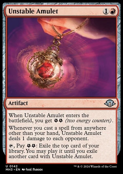 When Unstable Amulet enters the battlefield, you get {E}{E} (two energy counters).