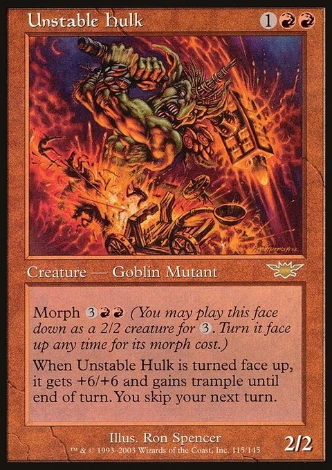 Morph {3}{R}{R} (You may cast this card face down as a 2/2 creature for {3}. Turn it face up any time for its morph cost.) When Unstable Hulk is turned face up, it gets +6/+6 and gains trample until end of turn. You skip your next turn.