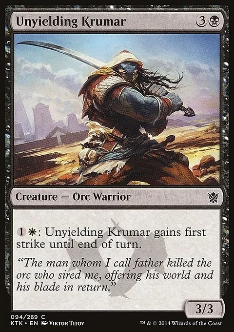 {1}{W}: Unyielding Krumar gains first strike until end of turn.