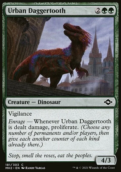 Vigilance Enrage — Whenever Urban Daggertooth is dealt damage, proliferate. (Choose any number of permanents and/or players, then give each another counter of each kind already there.)