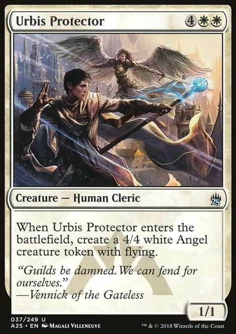 When Urbis Protector enters the battlefield, create a 4/4 white Angel creature token with flying.