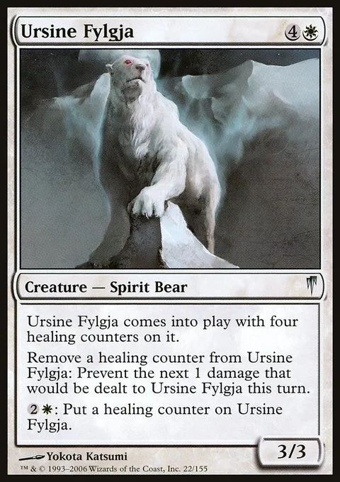 Ursine Fylgja enters the battlefield with four healing counters on it. Remove a healing counter from Ursine Fylgja: Prevent the next 1 damage that would be dealt to Ursine Fylgja this turn. {2}{W}: Put a healing counter on Ursine Fylgja.