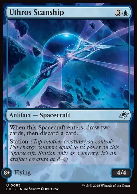 When this Spacecraft enters, draw two cards, then discard a card. Station (Tap another creature you control: Put charge counters equal to its power on this Spacecraft. Station only as a sorcery. It's an artifact creature at 8+.) STATION 8+ Flying