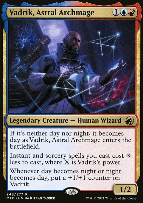 If it's neither day nor night, it becomes day as Vadrik enters. Instant and sorcery spells you cast cost {X} less to cast, where X is Vadrik's power. Whenever day becomes night or night becomes day, put a +1/+1 counter on Vadrik.