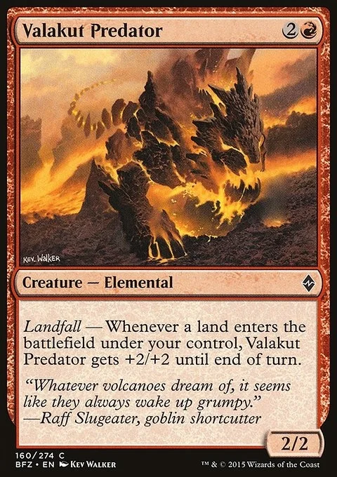 Landfall — Whenever a land enters the battlefield under your control, Valakut Predator gets +2/+2 until end of turn.
