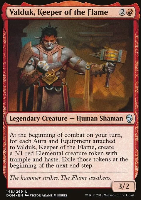 At the beginning of combat on your turn, for each Aura and Equipment attached to Valduk, Keeper of the Flame, create a 3/1 red Elemental creature token with trample and haste. Exile those tokens at the beginning of the next end step.