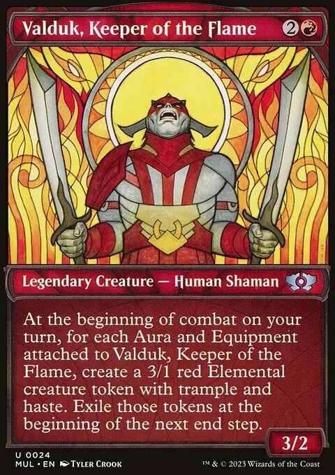 At the beginning of combat on your turn, for each Aura and Equipment attached to Valduk, Keeper of the Flame, create a 3/1 red Elemental creature token with trample and haste. Exile those tokens at the beginning of the next end step.