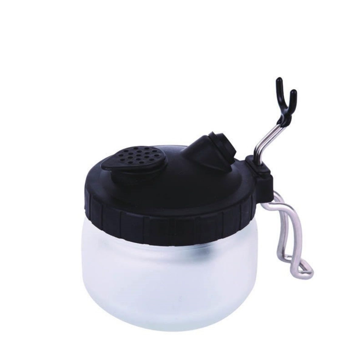 Airbrush cleaning pot, glass with plastic lid, used to spray-clean airbrush. The airbrush is inserted into the opening of the plastic lid and is cleaned by spraying Vallejo Airbrush Cleaner #71.099 or water into the container.