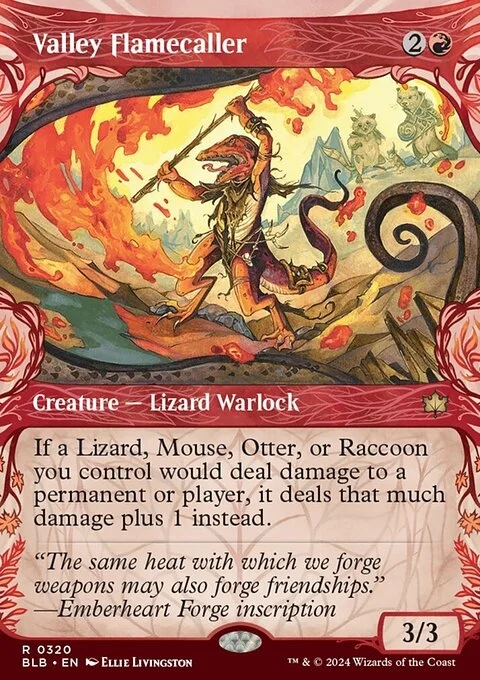 If a Lizard, Mouse, Otter, or Raccoon you control would deal damage to a permanent or player, it deals that much damage plus 1 instead.