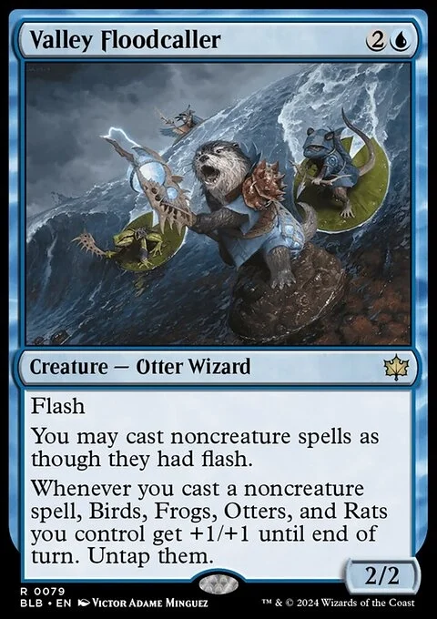 Flash You may cast noncreature spells as though they had flash. Whenever you cast a noncreature spell, Birds, Frogs, Otters, and Rats you control get +1/+1 until end of turn. Untap them.