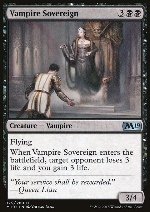 Flying When Vampire Sovereign enters the battlefield, target opponent loses 3 life and you gain 3 life.