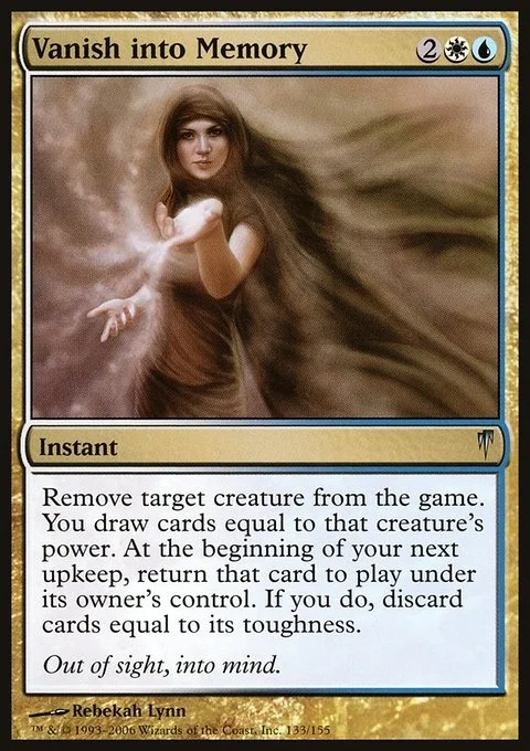 Exile target creature. You draw cards equal to that creature's power. At the beginning of your next upkeep, return that card to the battlefield under its owner's control. If you do, discard cards equal to that creature's toughness.