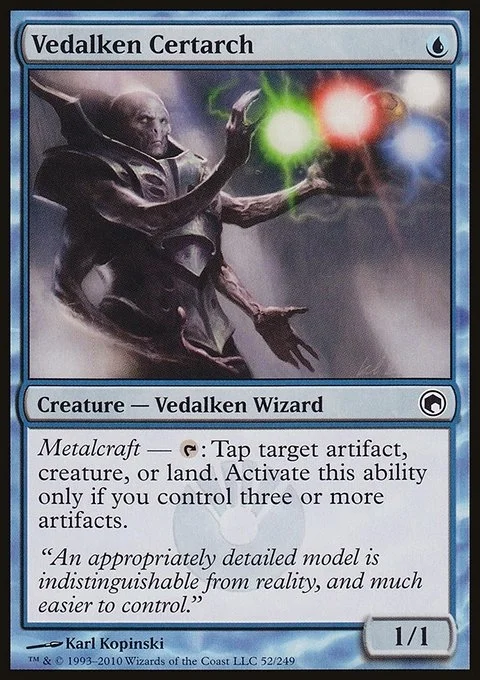 Metalcraft — {T}: Tap target artifact, creature, or land. Activate this ability only if you control three or more artifacts.