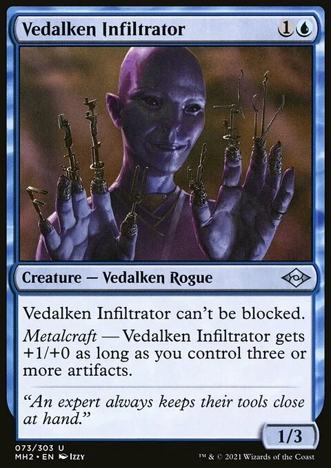 Vedalken Infiltrator can't be blocked. Metalcraft — Vedalken Infiltrator gets +1/+0 as long as you control three or more artifacts.