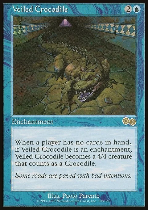 When a player has no cards in hand, if Veiled Crocodile is an enchantment, Veiled Crocodile becomes a 4/4 creature that counts as a Crocodile.