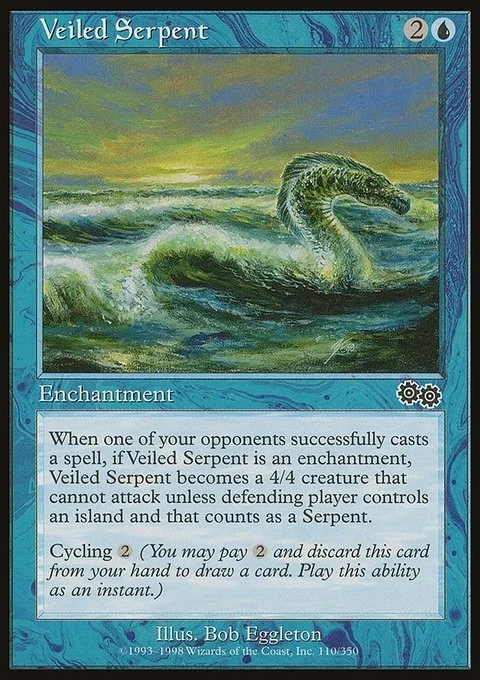 When an opponent casts a spell, if Veiled Serpent is an enchantment, Veiled Serpent becomes a 4/4 Serpent creature with "This creature can't attack unless defending player controls an Island." Cycling {2} ({2}, Discard this card: Draw a card.)