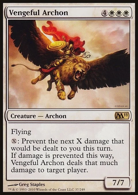 Flying {X}: Prevent the next X damage that would be dealt to you this turn. If damage is prevented this way, Vengeful Archon deals that much damage to target player or planeswalker.