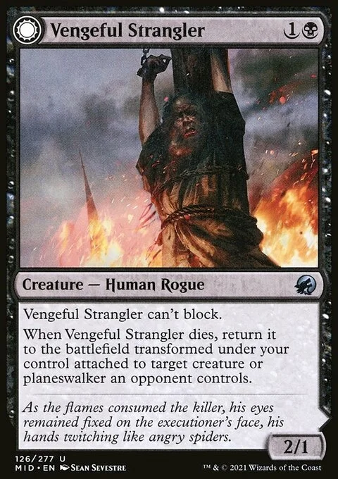 When Vengeful Strangler dies, return it to the battlefield transformed under your control attached to target creature or planeswalker an opponent controls.