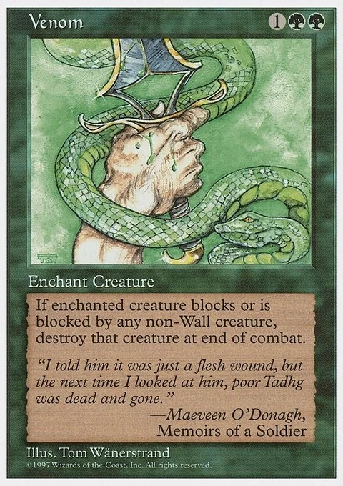 Enchant creature Whenever enchanted creature blocks or becomes blocked by a non-Wall creature, destroy the other creature at end of combat.