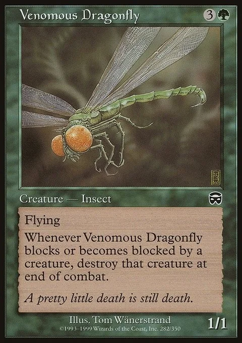 Flying Whenever Venomous Dragonfly blocks or becomes blocked by a creature, destroy that creature at end of combat.