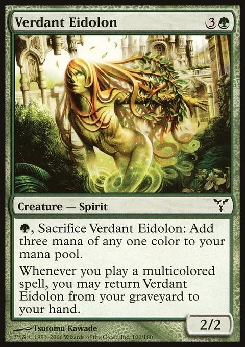 {G}, Sacrifice Verdant Eidolon: Add three mana of any one color. Whenever you cast a multicolored spell, you may return Verdant Eidolon from your graveyard to your hand.