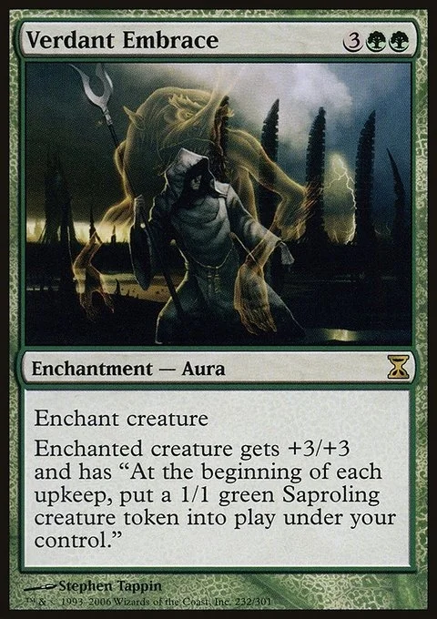 Enchant creature Enchanted creature gets +3/+3 and has "At the beginning of each upkeep, create a 1/1 green Saproling creature token."