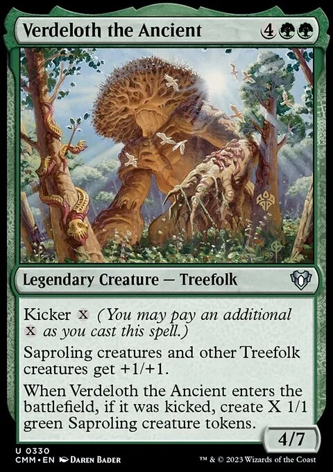 Kicker {X} (You may pay an additional {X} as you cast this spell.) Saproling creatures and other Treefolk creatures get +1/+1. When Verdeloth enters, if it was kicked, create X 1/1 green Saproling creature tokens.