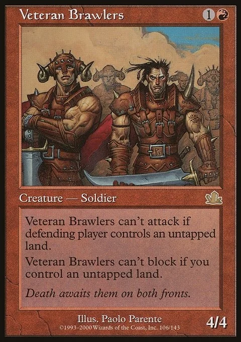 Veteran Brawlers can't attack if defending player controls an untapped land. Veteran Brawlers can't block if you control an untapped land.