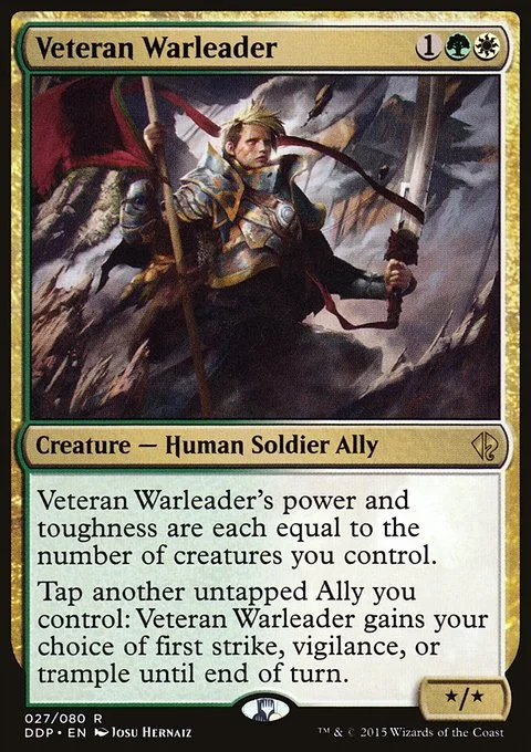 Veteran Warleader's power and toughness are each equal to the number of creatures you control. Tap another untapped Ally you control: This creature gains your choice of first strike, vigilance, or trample until end of turn.