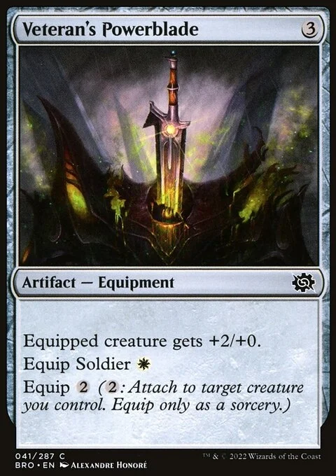 Equipped creature gets +2/+0. Equip Soldier {W} Equip {2} ({2}: Attach to target creature you control. Equip only as a sorcery.)