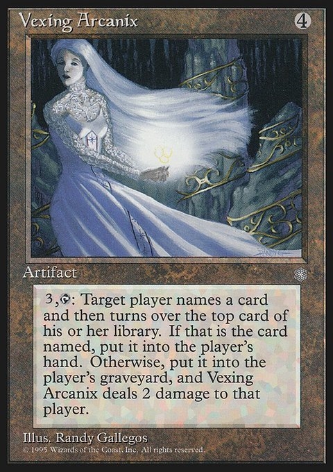 3, T: Target player names a card and then turns over the top card of his or her library. If that is the card named, put it into the player’s hand. Otherwise, put it into the player’s graveyard, and Vexing Arcanix deals 2 damage to that player.