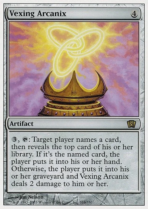 {3}, {T}: Target player chooses a card name, then reveals the top card of their library. If that card has the chosen name, that player puts it into their hand. Otherwise, they put it into their graveyard and Vexing Arcanix deals 2 damage to them.