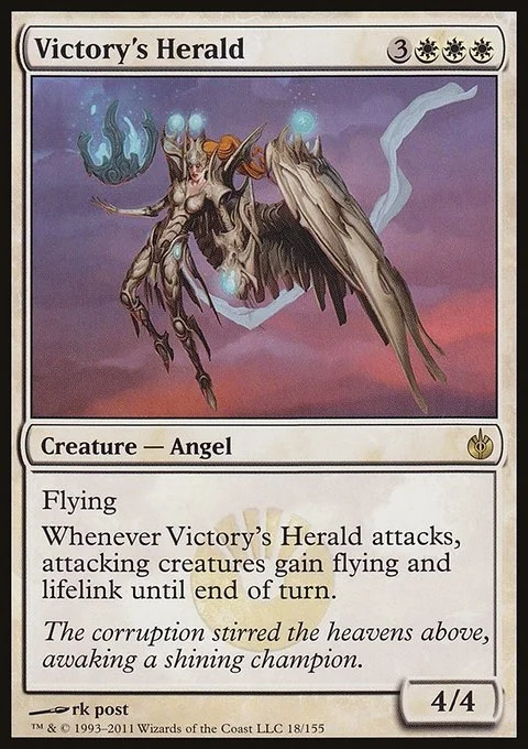 Flying Whenever Victory's Herald attacks, attacking creatures gain flying and lifelink until end of turn.