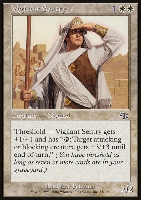 Threshold — As long as seven or more cards are in your graveyard, Vigilant Sentry gets +1/+1 and has "{T}: Target attacking or blocking creature gets +3/+3 until end of turn."